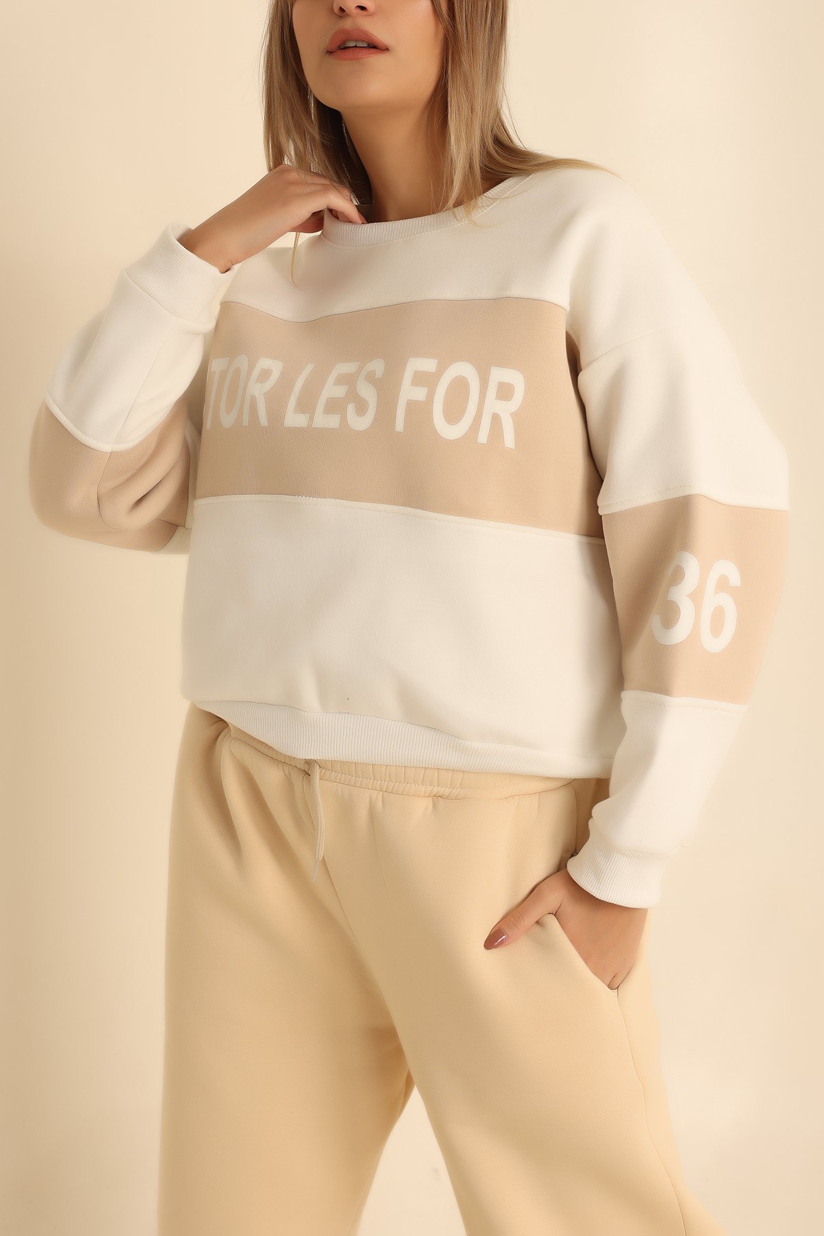 Krem Cep Taş İşlemeli Yaka Detaylı Belden Bağlamalı Scuba Kumaş İkili Takım