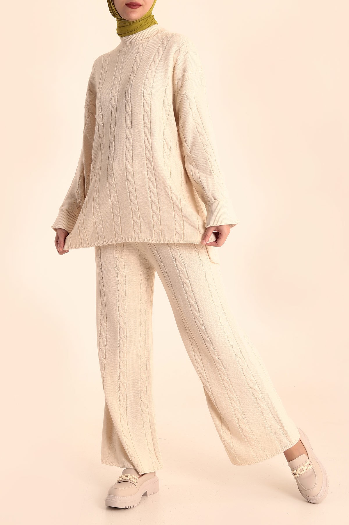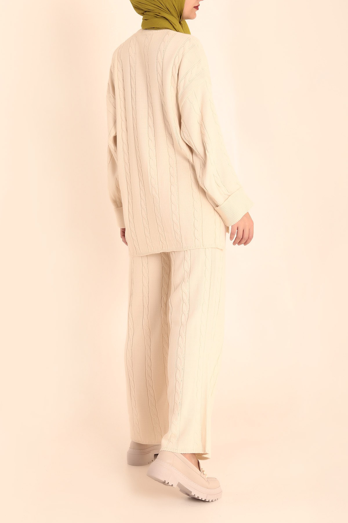 Renk: Krem Mevsim: Dört Mevsim Boy: Orta Boy Kalıp: Normal Kalıp Kol: Uzun Kol Numune Beden: Standart Ürün Boyu Üst: 65 cm Alt: 100 cm Kumaş Türü: %70 Akrilik %30 Pamuk