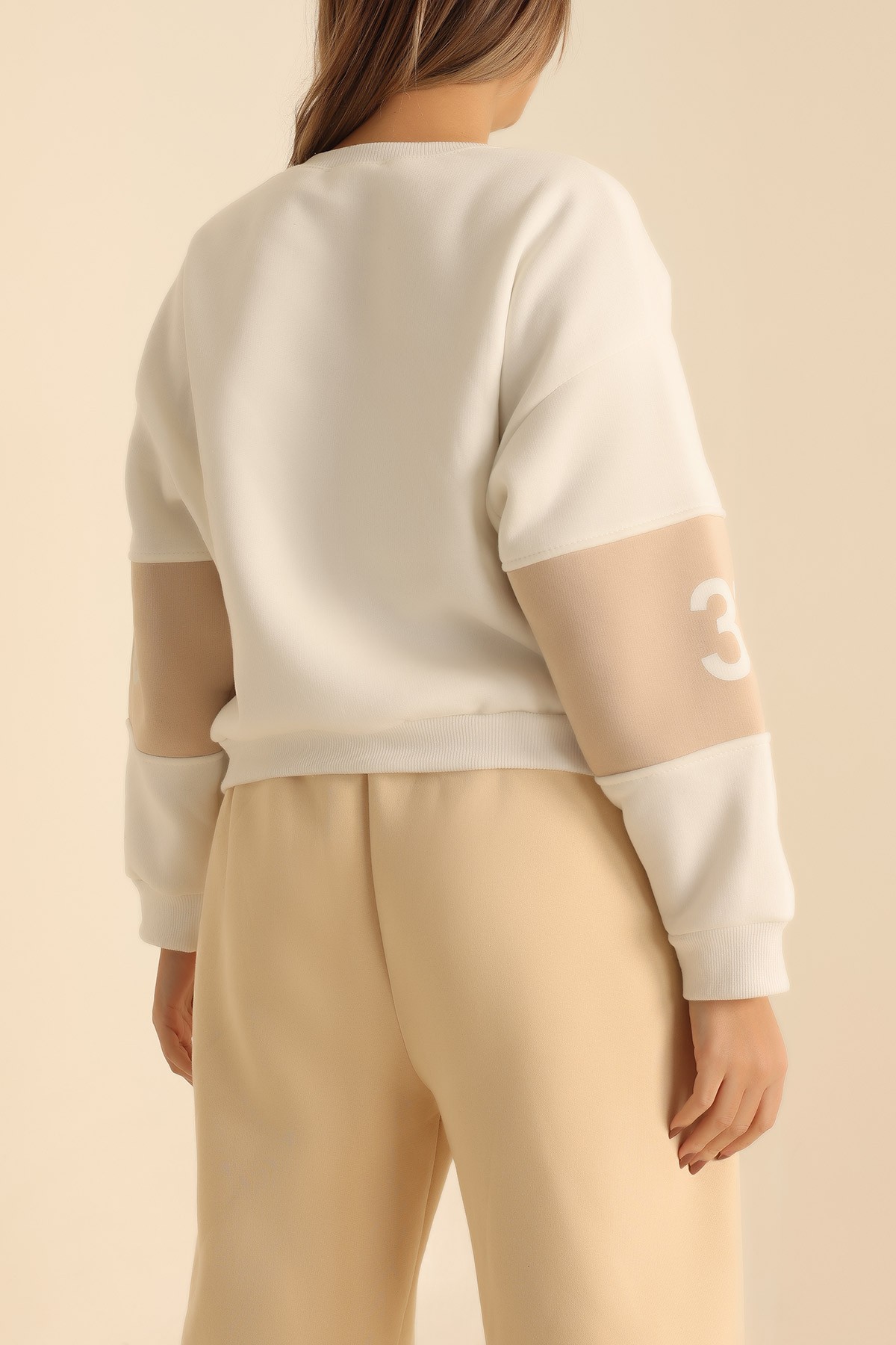 Krem Cep Taş İşlemeli Yaka Detaylı Belden Bağlamalı Scuba Kumaş İkili Takım